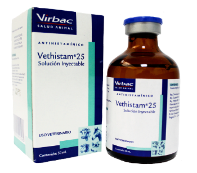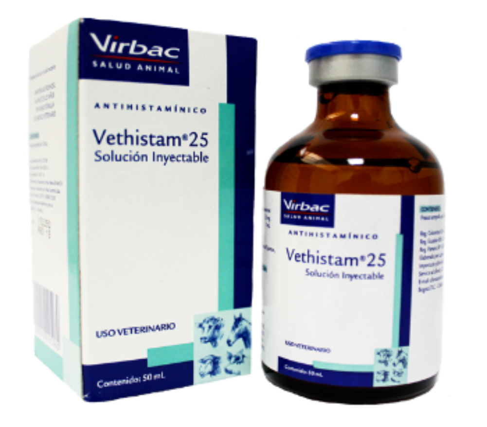 Es una solución inyectable compuesta por difenhidramina clorhidrato al 25%, indicado en todas aquellas afecciones originadas por una liberación excesiva de histamina y por destrucción grave de tejidos o toxemias severas tales como: estados de shock (anafiláctico, post-operatorio y postraumático), sensibilización a fármacos y alimentos, reacciones alérgicas de diversa índole, fotosensibilización, dermatitis o dermatosis de origen alérgico, coadyuvante en intoxicaciones por compuestos organofosforados, toxemias debidas a toxinas bacterianas, parasitarias y tóxicos químicos.